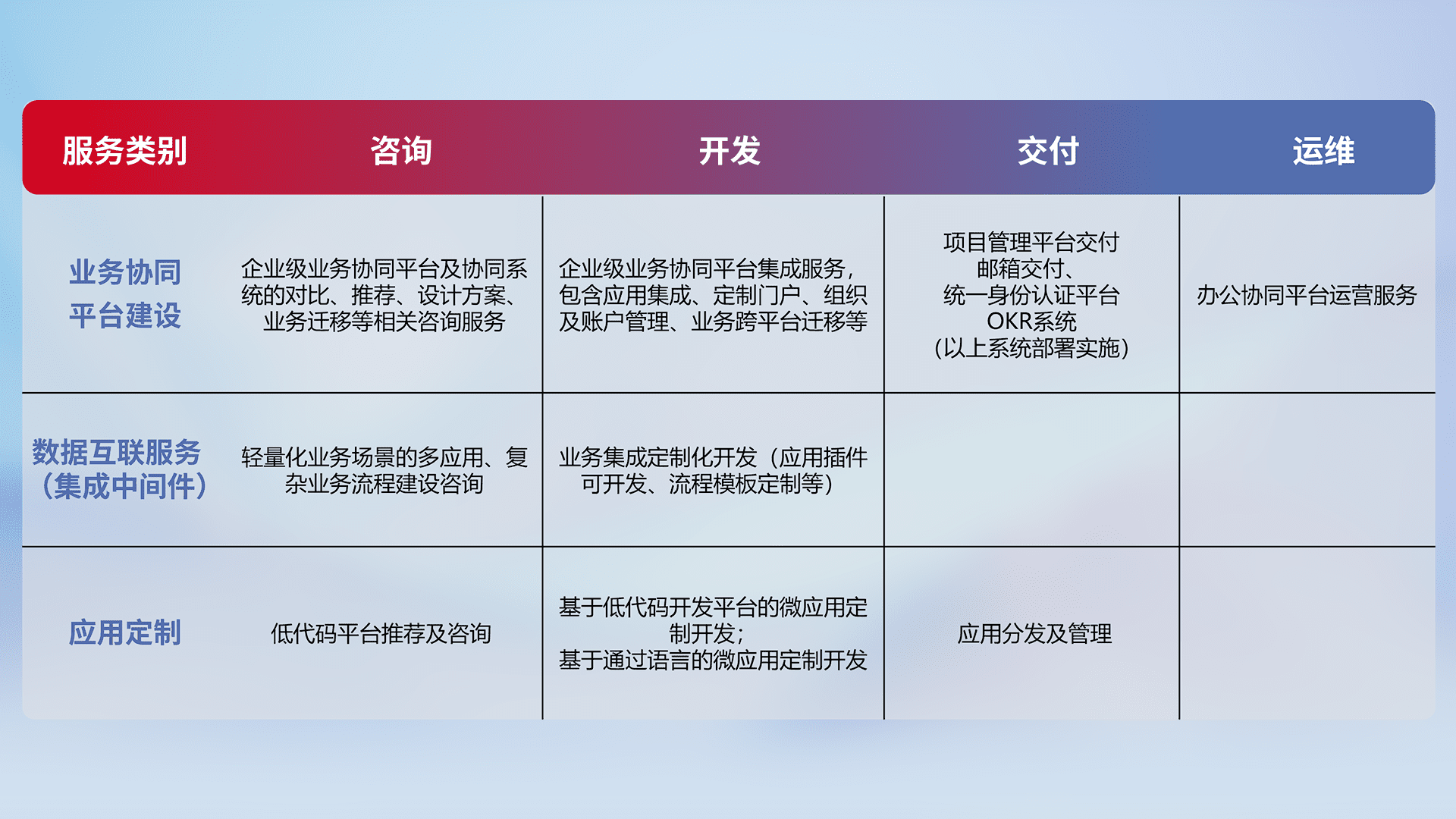针对钉钉、、企微、、、IDaas等平台级产品提供产品的规划、、、方案、、交付、、、、定制化开发等服务,,,实现如统一协同办公、、、智能客户服务、、混合会议管理、、智能数据查询、、、等业务场景,,实现数字化转型。。