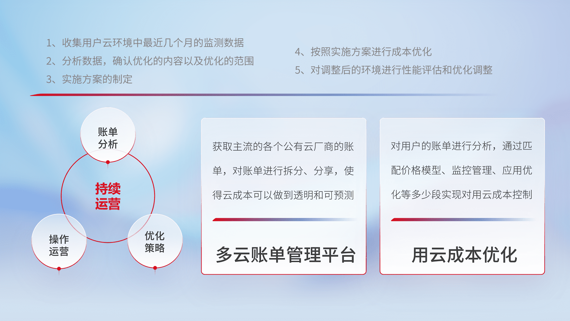 通过多云纳管,,,以统一的资源数据模型把客户的云资源进行抽象和封装,,,进而实现对多云资源的统一操作,,,,保障云资源管理的可靠性、、稳定性与可用性。。。。量身定制化运维内容,,,配置、、、开发运维、、、、补丁管理、、、、备份、、、、监控、、、认证和访问管理、、、审计和日常巡检等,,保障在用云过程中的可靠度,,,稳定度以及高可用率。。。。