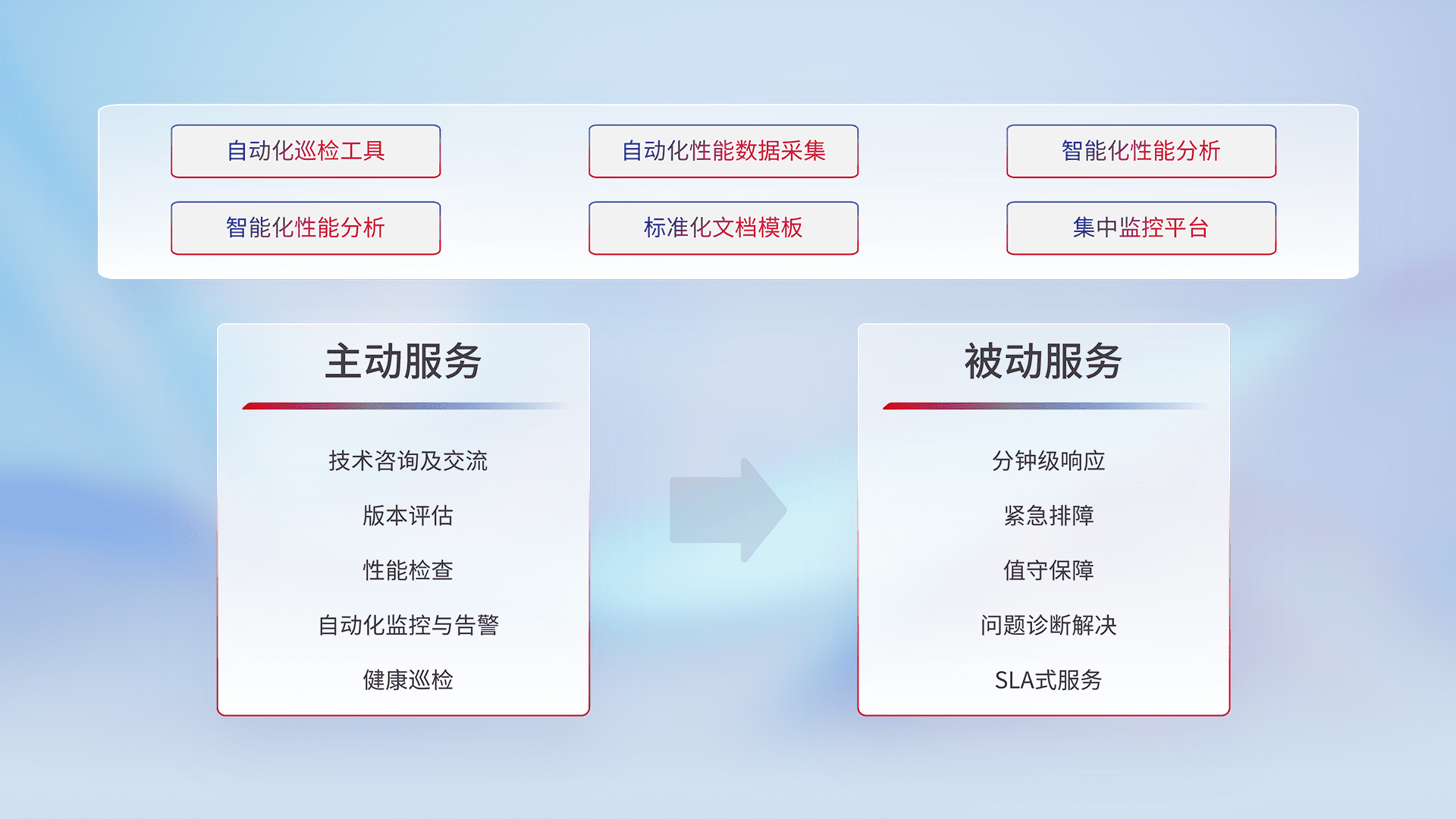 智能化工具和标准化文档,,,保障服务质量,,,,提供主动服务(包含技术咨询、、、版本评估、、、性能检查、、、、自动化监控与告警、、、、健康巡检)和被动服务包含(分钟级响应、、、、紧急排障、、、值守保障、、、、问题诊断解决、、、、SLA服务)。。。。