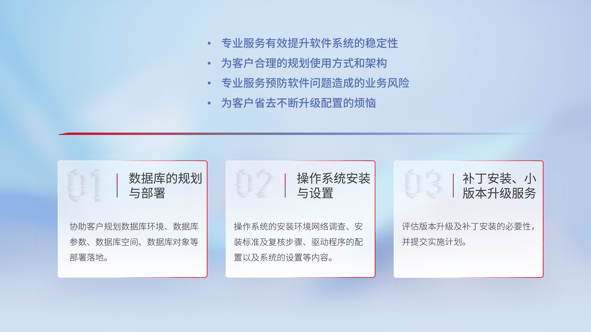 为客户提供软件规模升级、、、快速部署、、、按需配置的专业服务,,,,从数据库的规划与部署到操作系统的安装与设置,,,,再到补丁安装和小版本升级提供支持。。