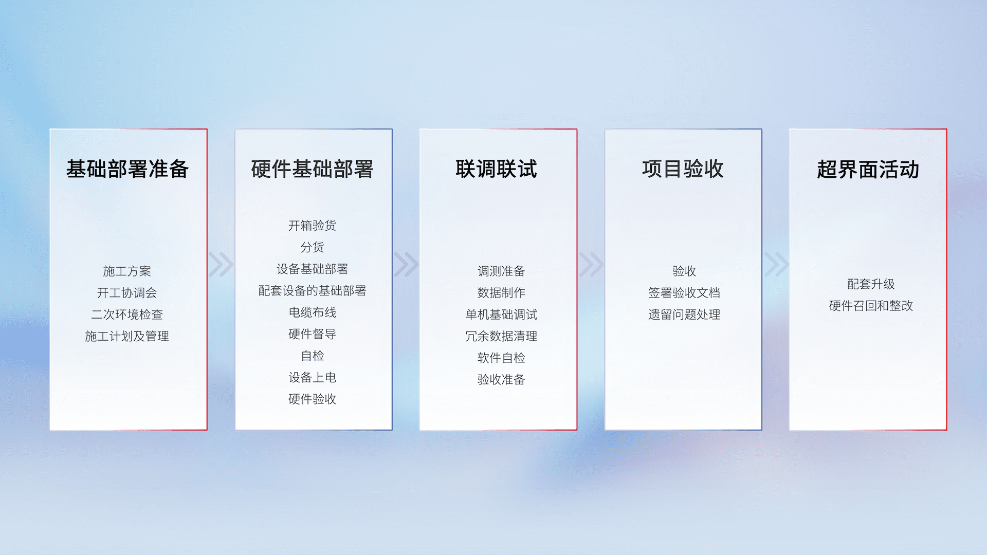 从基础部署准备、、、、硬件基础部署、、联调联试、、、、项目验收、、、越界面活动的全过程可追溯,,,,保证施工质量和进度。。。。